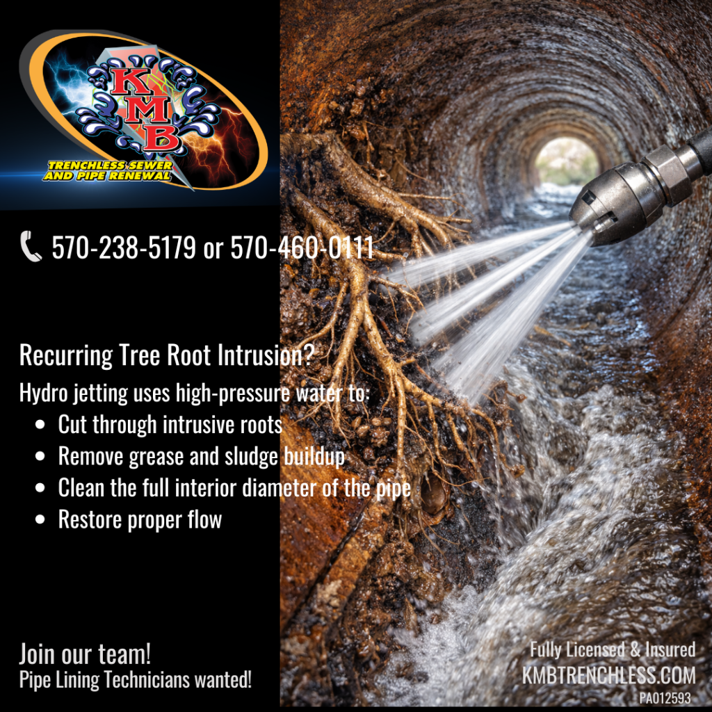 If your sewer line keeps clogging, tree roots may be the hidden cause. Roots naturally seek moisture, and even the smallest crack or loose joint in a sewer pipe can attract them. Once inside, they continue to grow, trapping toilet paper, debris, and waste. The result? Slow drains, gurgling sounds, recurring backups, and repeated service calls. Unlike basic snaking, jetting thoroughly scours the pipe, reducing the chance of immediate re-clogging and improving overall drainage performance. If roots keep coming back, it may be time to look deeper with a sewer camera inspection and discuss long-term trenchless solutions. Don’t keep clearing the same clog. Contact KMB Trenchless Sewer & Pipe Renewal today.
